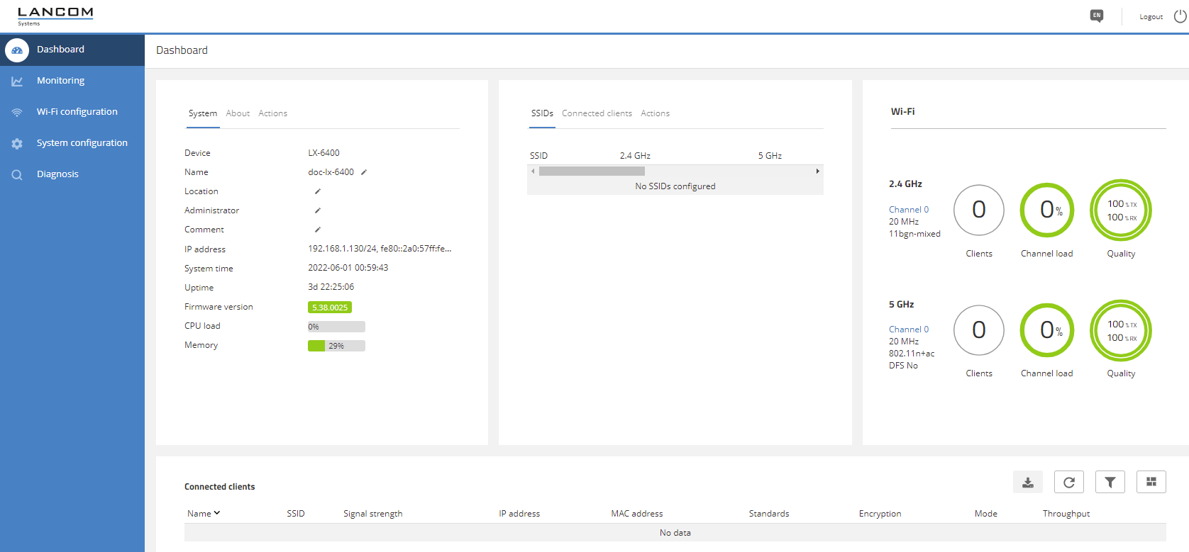 - Monitoring – graphical representation of the WLAN throughput, LAN throughput, number of WLAN stations and channel load over time.