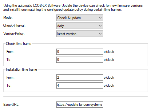 Set the time frame for update installations here. The daily start and end time for this time frame can be set to the hour. The default setting specifies a time frame between 2:00 AM and 4:00 AM. If an update is found, it will be installed during this time and the device will be restarted to activate the update. The Auto Updater schedules a random time for the installation within the configured time frame.