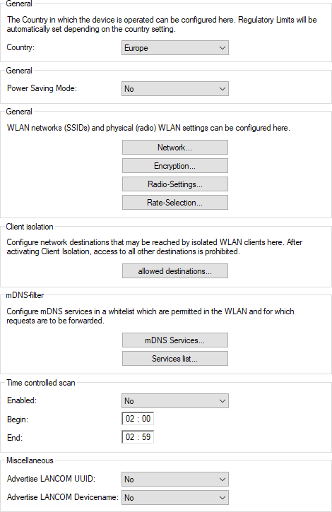 - Here you configure the country where the device is operated. Depending on this, the appropriate regulatory limits are set automatically.