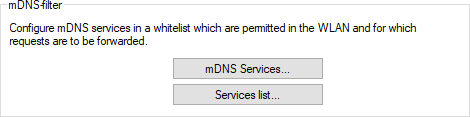 Since mDNS requests are sent as multicast, transmission at the WLAN level must use the lowest permitted data rate, which can consume significant airtime depending on the volume of mDNS requests. With the mDNS filter, requests to definable mDNS services can be selectively allowed for forwarding over the WLAN.