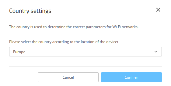 Here you configure the country where the device is operated. Depending on this, the appropriate regulatory restrictions are set automatically.