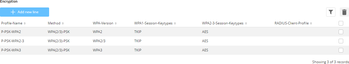 Note: Employing TKIP is only recommended for operating older WLAN clients which do not support AES.Note: If a WLAN network uses only WEP or WPA with TKIP for encryption, the WLAN clients connected to it achieve a maximum gross data rate of 54 Mbps. - WPA2/3-Session-Keytypes
