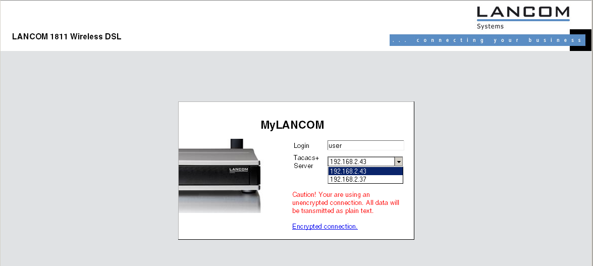 Using WEBconfig to login to a device with activated TACACS+ authentication is possible for any user configured on the TACACS+ server. When logging in with WEBconfig, enter the user name configured on the TACACS+ server and select the server which is to carry out authentication.