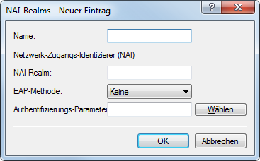 In order to edit the entries in the table NAI realms, click on the button Add.... The entries in the edit window have the following meaning: