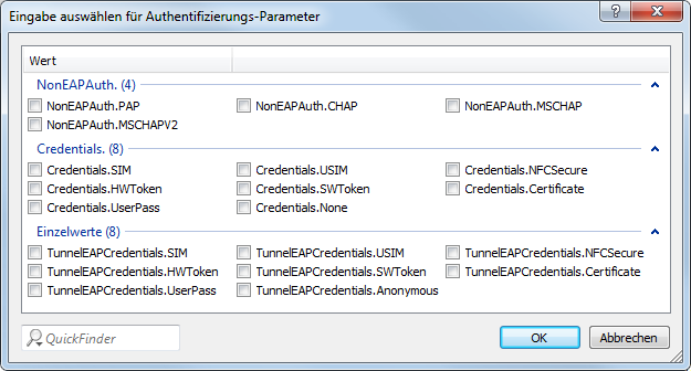 - Authentication parameters: In the window that opens when you click the Select button, select the appropriate authentication parameters for the EAP method, such as EAP-TTLS NonEAPAuth.MSCHAPV2,Credential.UserPass or for EAP-TLS Credentials.Certificate. Possible values include: