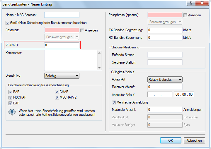 - Assign an individual VLAN ID to the new user with the input field VLAN-ID. After authentication by the RADIUS server, the individual VLAN ID overwrites a global VLAN ID that a user would otherwise obtain from the interface. The value 0 disables the assignment of an individual VLAN ID.