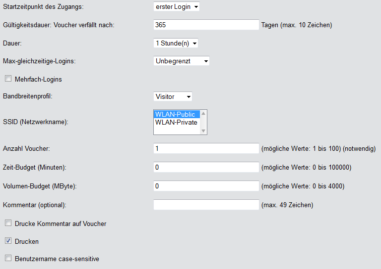 When you invoke the Wizard Create Public Spot account, you will see the menu item Max concurrent logins. The values shown here correspond to the numbers that you previously entered in the table of the same name. The values are shown within the phrase "Only ... device(s)".