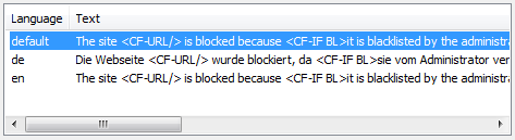 This is where you can define text to be displayed when blocking occurs. Different blocking texts can be defined for different languages. The display of blocking text is controlled by the language setting transmitted by the browser (user agent).