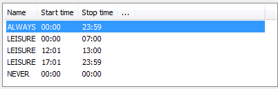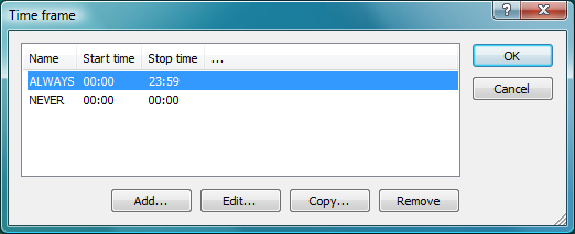 The timeframes “ALWAYS” and “NEVER” are predefined. You can configure other timeframes under: