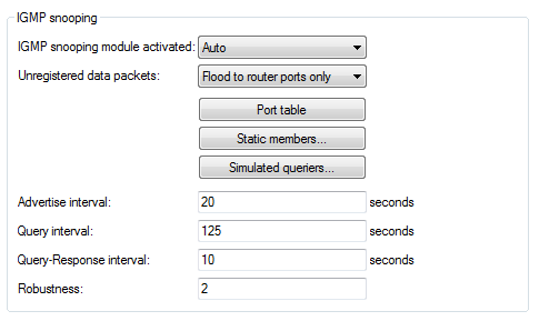 Activates or deactivates IGMP snooping in the device and all of the defined querier instances. Without IGMP snooping the bridge functions like a simple switch and forwards all multicasts to all ports. Possible values: