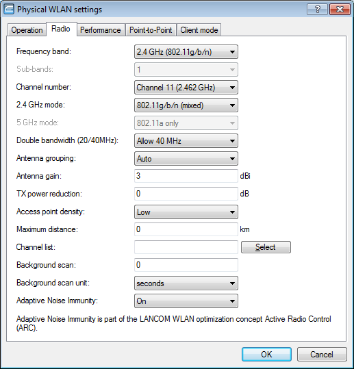 To enable the adaptive noise immunity function, go to the Radio tab and set the value in the selection field Adaptive noise immunity to "On".