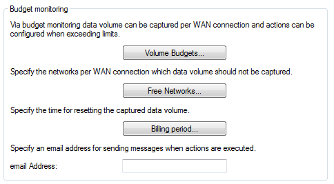 Depending on your tariff plan, mobile or landline operators may activate bandwidth throttling if a certain data volume is exceeded, also for flatrate plans. The device captures the amount of data sent over each WAN interface, archives the values for up to 12 months, and can perform actions when a specified threshold is reached. The budgets also apply to VPN, PPTP, or all other kinds of connection.