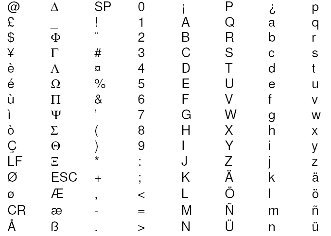 The following characters are defined in the GSM basic character set: