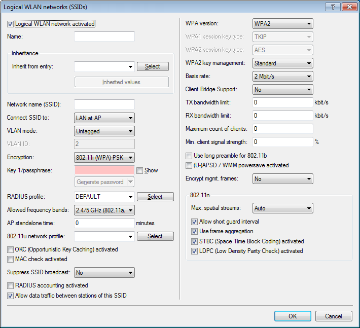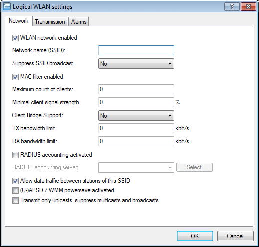 - TX bandwidth limitWith this setting, you define the overall bandwidth that is available for transmission within this SSID (limit in kbps). A value of 0 disables the limit.