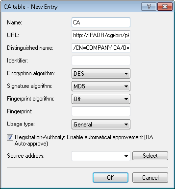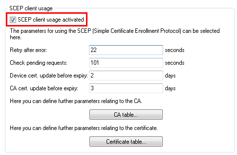 The values for the CA table match the settings of the SCEP server from step 1 and are thus the same for all stations. For the URL you enter http://IPADR/cgi-bin/pkiclient.exe, replacing IPADR with the IP address of the device configured as SCEP-CA.