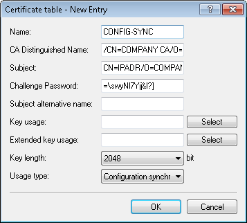 Set the Usage type to "Configuration synchronization". Also, adjust the Key length to "2048 bits". Set a Name of your choice for the table entry.