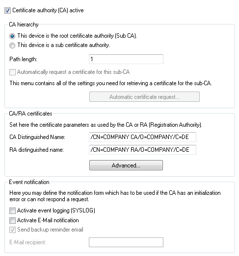 As the subject, enter each device's own IP address (e.g. /CN=IPADR /O=COMPANY/C=DE), replacing IPADR with the IP address of the device configured as SCEP-CA.
