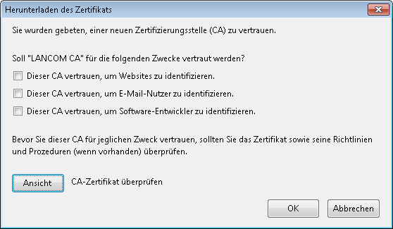 You can download the public part of the CA certificate without having to authenticate by using the link http://<URL>/getcacert/cacert.crt. The transmission uses the MIME type application/x-x 509-ca-cert, so that software with the appropriate functionality will immediately offer to the install the certificate.