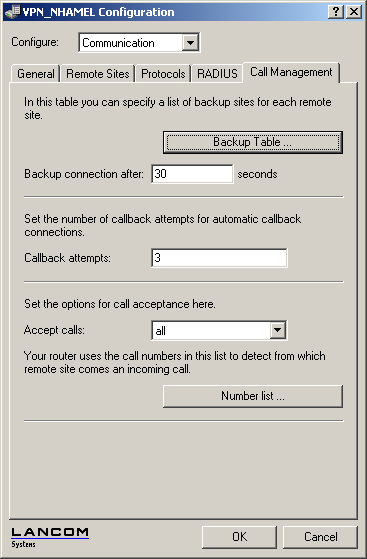 The backup delay time is set with LANconfig in the configuration area 'Communication' on the 'Call management' tab or alternatively with Telnet under /Setup/WAN-Modul/Backup-delay-seconds.