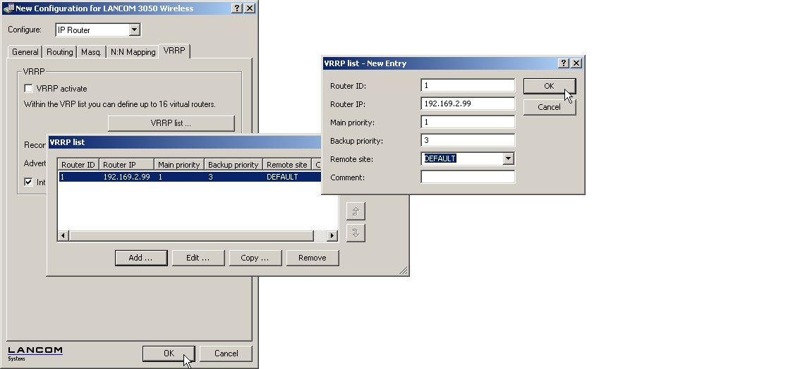 routers. Note: Entering the remote site is optional. Linking the backup requirement to a remote site allows the use of the LANCOM-specific enhancement to VRRP not only to secure against device failure (VRRP standard) but also against interface failure or disruption at a remote site.