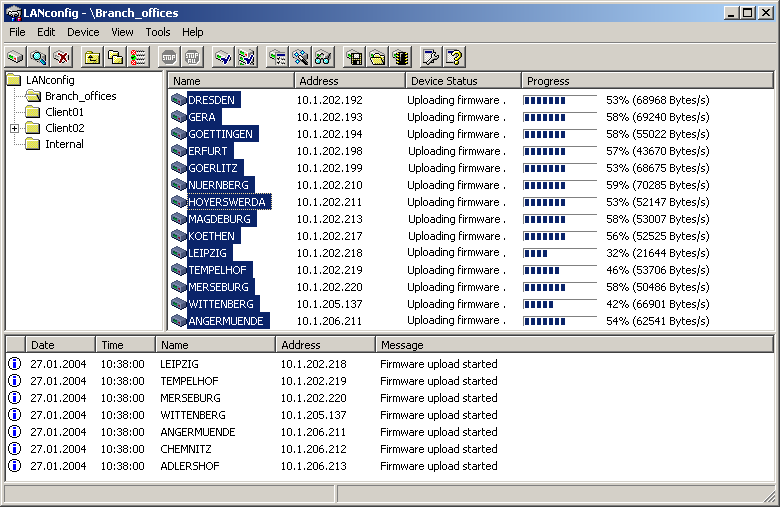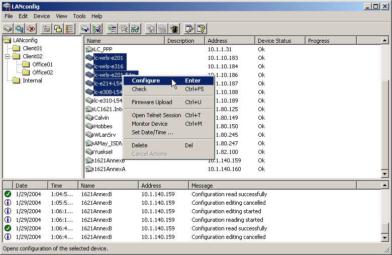 LANconfig facilitates the configuration of various devices within a project with a range of functions that can be run on several devices at once. If the list in LANconfig contains multiple devices, just click on the device of your choice with the right mouse key to open a context menu offering the following actions: