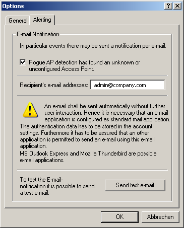 The WLANmonitor can inform the administrator automatically via e-mail whenever an unknown or unconfigured access point is discovered.