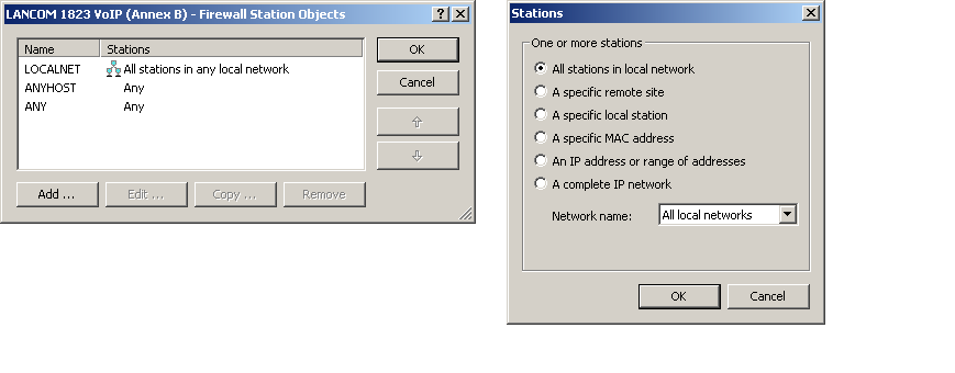 This is where the stations are defined that the firewall rules are to use as packet sender or addressee. The station objects are not restricted to any particular source or destination, but can be used as required by the firewall rules. In the context of Advanced Routing and Forwarding (ARF) you can specify a certain IP network as station object.