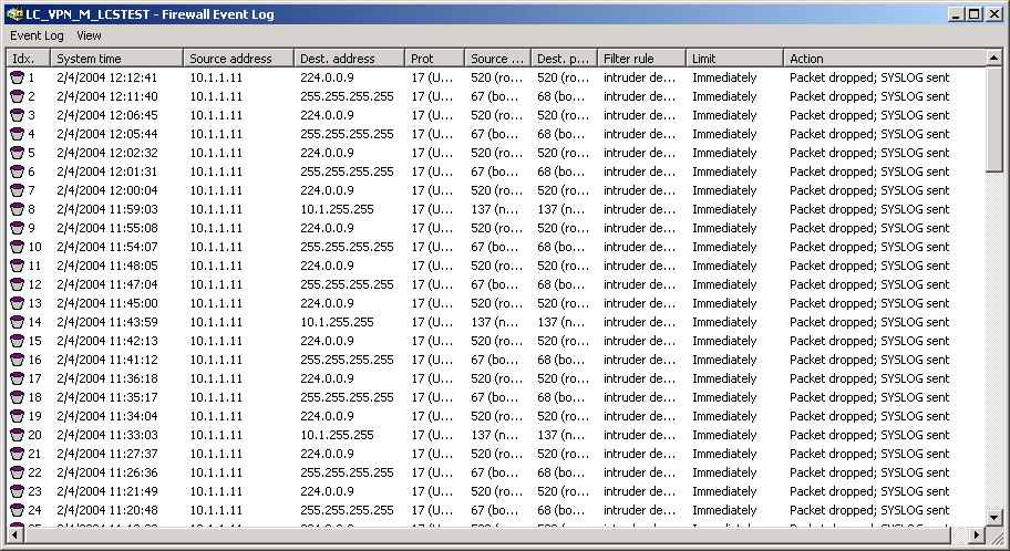 If an event occurred that had to be logged in either way, i.e. a log action was specified with the receipt of a packet, or a report by e-mail, Syslog or SNMP was generated, then this event is held in the logging table.