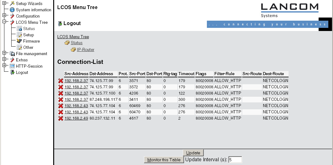 | Flags | In the flags the condition of the connection and further (internal) information are stored in a bit field. As conditions the following values are possible: new, establish, open, closing, closed, rejected (corresponding to the TCP flags: SYN, SYN ACK, ACK, FIN, FIN ACK and RST). UDP connections know the conditions new, open and closing (the last one only, if the UDP connection is linked with a condition-afflicted control path. This is e.g. the case with protocol H.323.). |