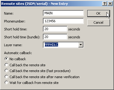 Via CBCP, it is possible to establish connection to the LANCOM from a PC with Windows operating system and also to be called back by this PC. Three possible settings are selected in the remote sites list via the callback entry as well as the calling number entry.
