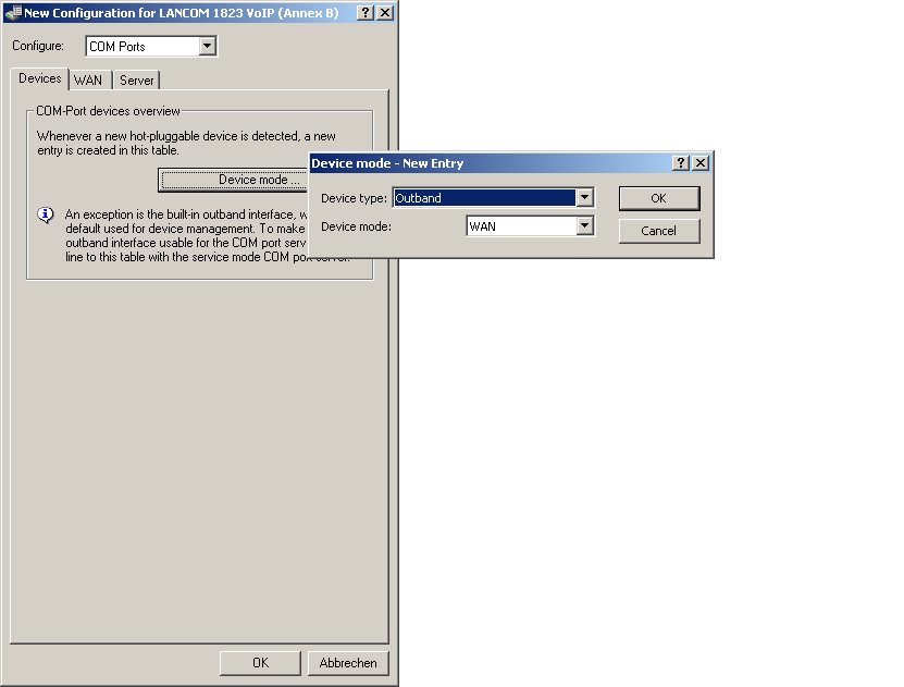 LANconfig: COM ports / Devices / Device operating mode