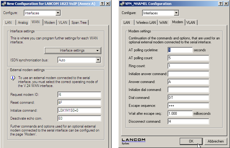 If the connection is to use a GPRS-capable modem at the serial interface, you will need the APN name and the dial-up telephone number. The following init-strings for the configuration apply to T-Mobile and Vodafone: