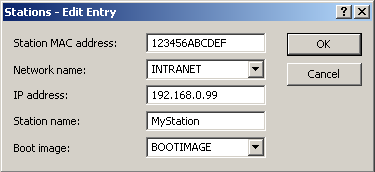 Enter the MAC address of the client that you wish to assign a fixed IP address to in the list of stations. You may also select a boot image that is to be assigned to this client. If this address assignment is only to be used if the client is in a particular IP network, enter the appropriate IP network.