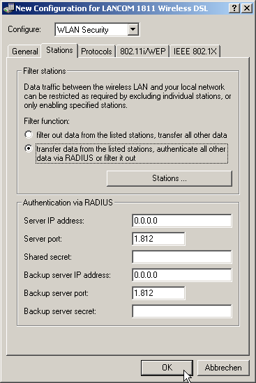 Note: To use the RADIUS functionality for WLAN clients, the option "Transfer