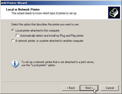 2. Select the option for a local printer and deactivate Plug&Play.