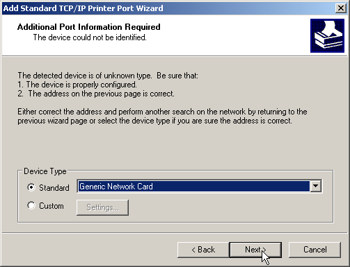 1. As the device type, select the option 'Standard' for a 'Generic Network Card'. If you wish to keep the standard settings (recommended), press on Next to proceed to the next dialog.