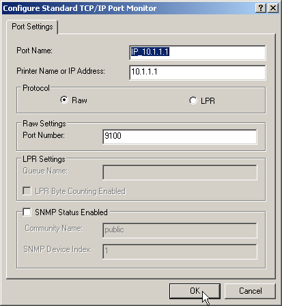 Note: The dialog for selecting the protocol and port can also be accesses via the Control Panel by opening the Printer Properties and accessing the 'Ports' tab.
