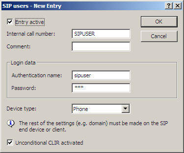 - Secret Password for authentication to the SIP proxy, and also to any upstream SIP PBX, when the user's domain is the same as the domain of a SIP PBX line. It is possible for users to log in to the local SIP proxy without authentication ("Force local authentication" is deactivated for SIP users) and where applicable to an upstream SIP PBX using a shared password ("Standard password" on the SIP PBX line).