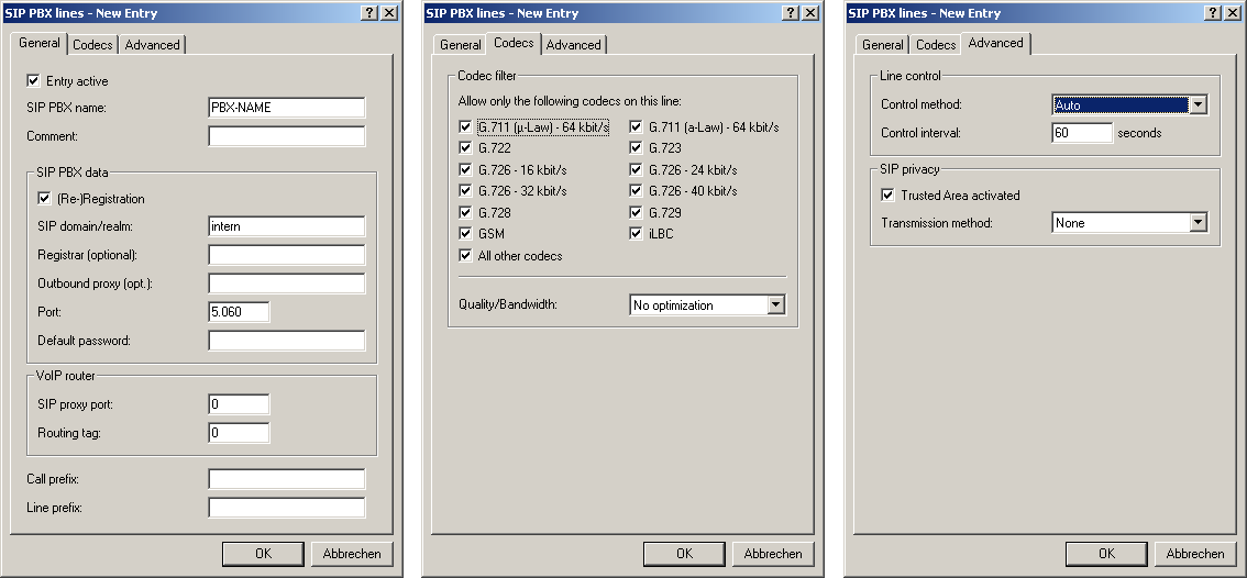 These lines are used to configure connections to upstream SIP PBXs, which are usually connected via VPN.