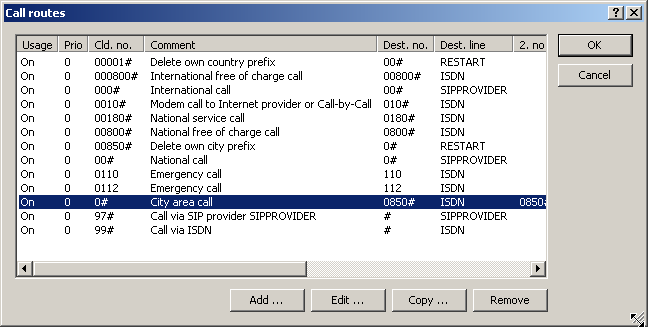 This suggested call routing table would place all external calls over the ISDN line. The SIP line is set up as a backup for international and national long distance calls and local calls that are not in the list of special or emergency numbers.