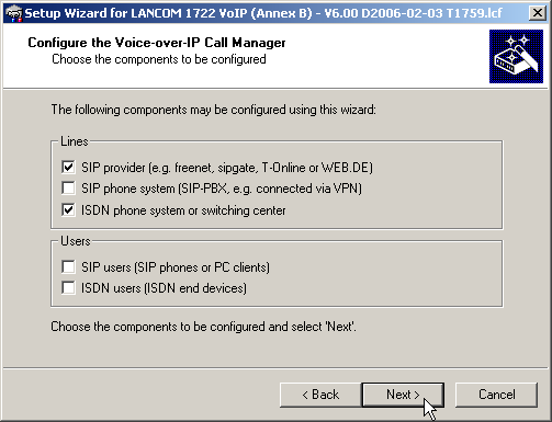 1. Under LANconfig, start the setup wizard for configuring the VoIP Call Manager. Enable the options 'SIP phone system', 'ISDN phone system' and 'ISDN users'.