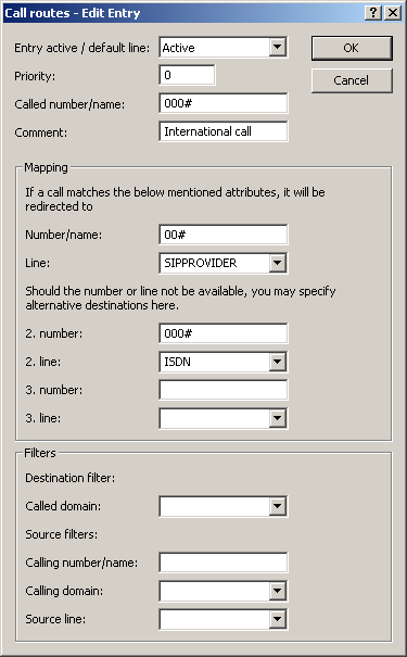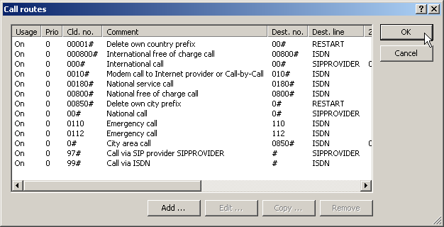3. In order to allow the ISDN subscribers to be contacted internally by the VoIP users, a standard route is also set up which directs all calls that have not yet been resolved to the ISDN line without changing the numbers. After being adapted, the call routing table should appear as follows:
