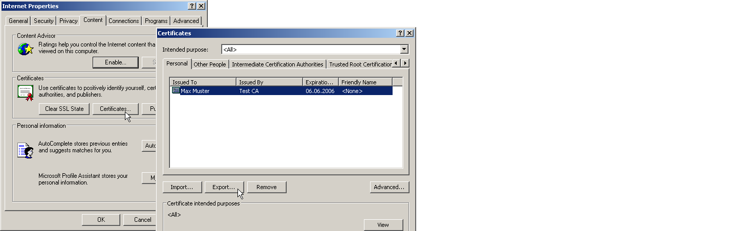 - To do this, click on Start / Control Panel / Internet Options, the 'Contents' tab and the button Certificates.