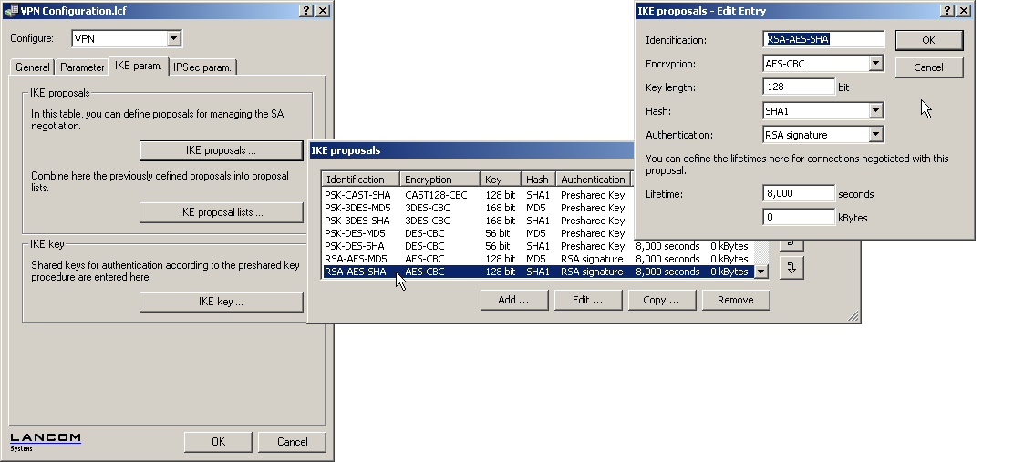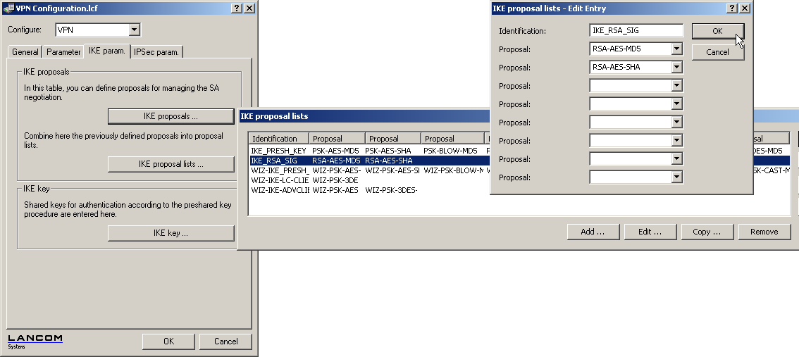 LANconfig: VPN / IKE param. / IKE proposal lists