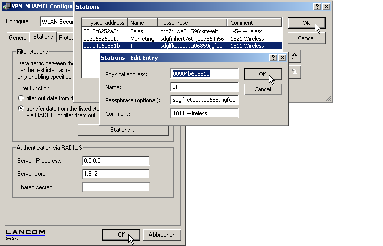 When using LANconfig for the configuration, you enter the passphrases of the stations approved for the WLAN in the configuration area 'Wireless LAN' on the 'Stations' tab under the button Stations.