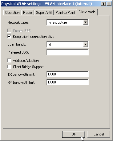 LANconfig: Interfaces / Wireless LAN / Physical WLAN Settings / Client Mode