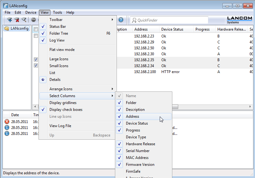 As a help for large-scale projects, LANconfig provides a better overview and quicker orientation with its columns featuring device-related details that can be shown or hidden according to your needs. Choose the columns to be displayed from . The menu item allows you to sort the items as you prefer.
