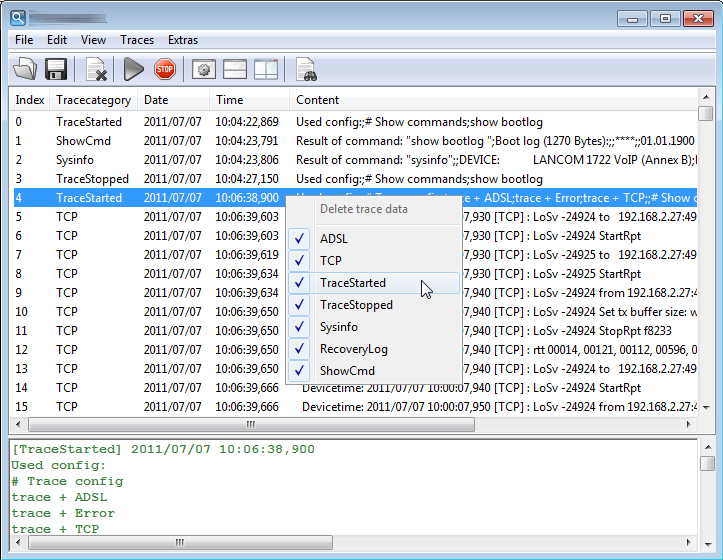 For easier navigation within long trace dumps, click a trace event in the upper area. The appropriate result is then enabled in the list and highlighted in the lower section in green. Right-clicking a trace event opens up a context menu from where individual trace results can be shown/hidden.