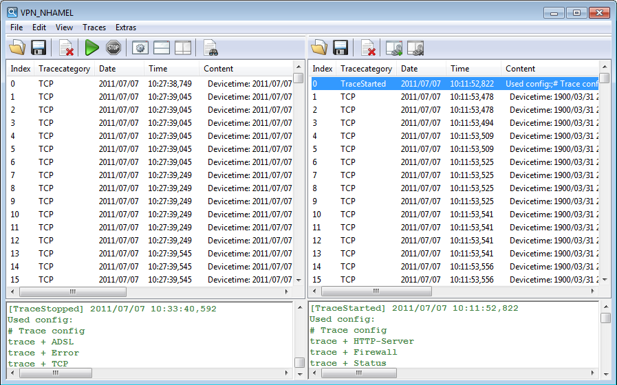 The entire trace configuration is shown in the lower area of the dialog where all active Trace, Status and Show entries are listed with the respective filters and parameters.
