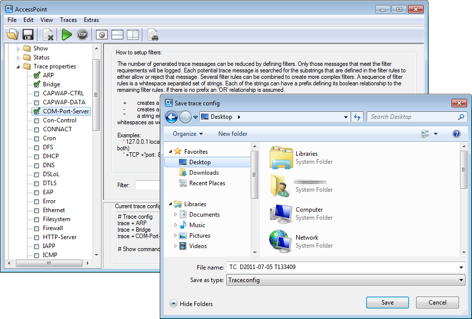 For later editing, or for transfer to another user, the actual trace data can be written to a storage medium with 'File > Save trace data/support configuration' and later re-opened with 'File > Load trace data'.